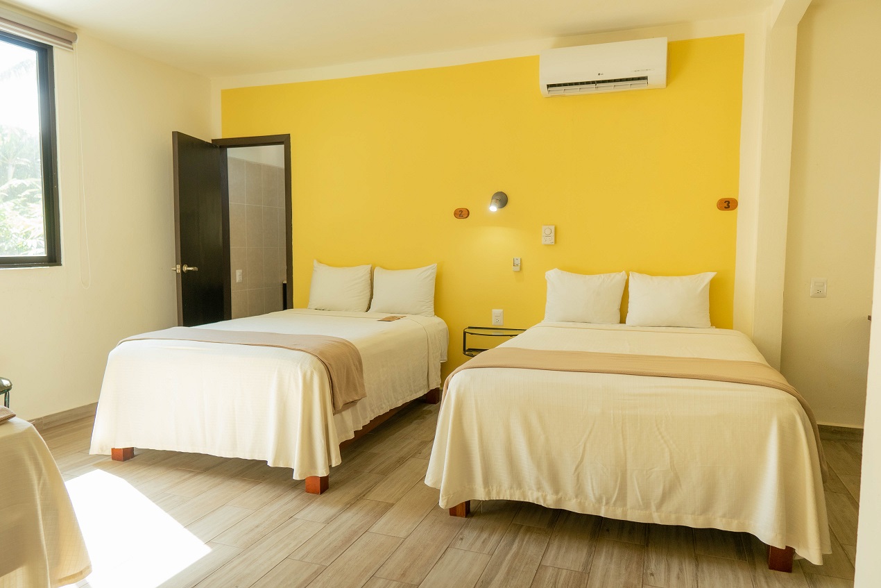 Habitación Cuádruple:Habitación con dos camas matrimoniales equipada con Internet, baño privado, televisión de pantalla plana de 32", y aire acondicionado.