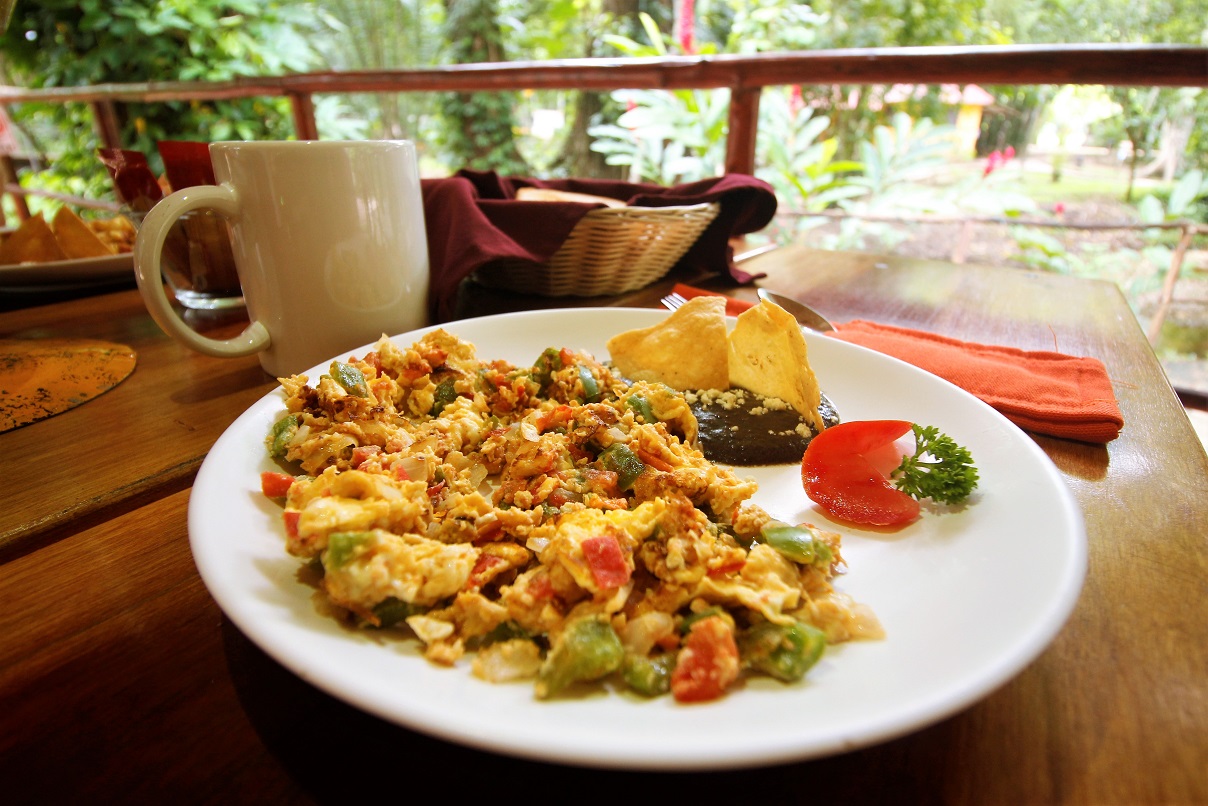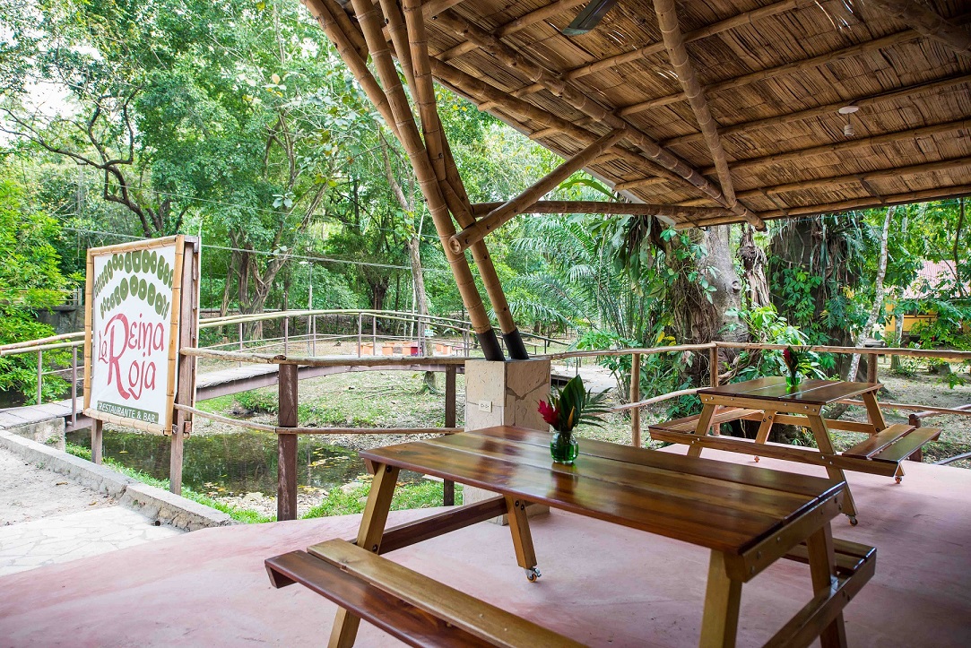 En nuestro restaurante La Reina Roja podrás disfrutar de un menú de desayunos, comidas y cenas, con bebidas y platillos de la región y unas deliciosas invenciones del chef, junto con opciones veganas, todo esto mientras se relaja dentro de un ambiente al natural rodeado de monos saraguatos y guacamayas rojas volando en libertad. Así mismo, durante algunas noches disponemos de ambientación musical en vivo para amenizar tu cena.